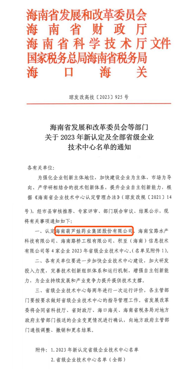 近日,海南省发改委等多部门联合公布了《关于2023年新认定及全部省级企业技术中心名单的通知》,其中,海南必威betway药业集团股份有限公司成功通过评审,被认定为省级企业技术中心,是本次获批的4家企业之一。